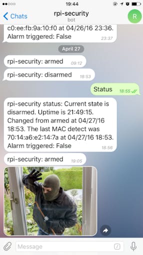 If the system is in an armed state and motion is detected then a message with the captured image is sent to you from the Telegram bot.